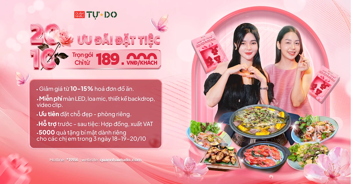 Mừng 20/10 cùng Nhậu Tự Do! Giảm tới 15% khi đặt tiệc, tặng hộp quà bí mật cho khách nữ. Số lượng ưu đãi có hạn – đặt bàn ngay hôm nay!