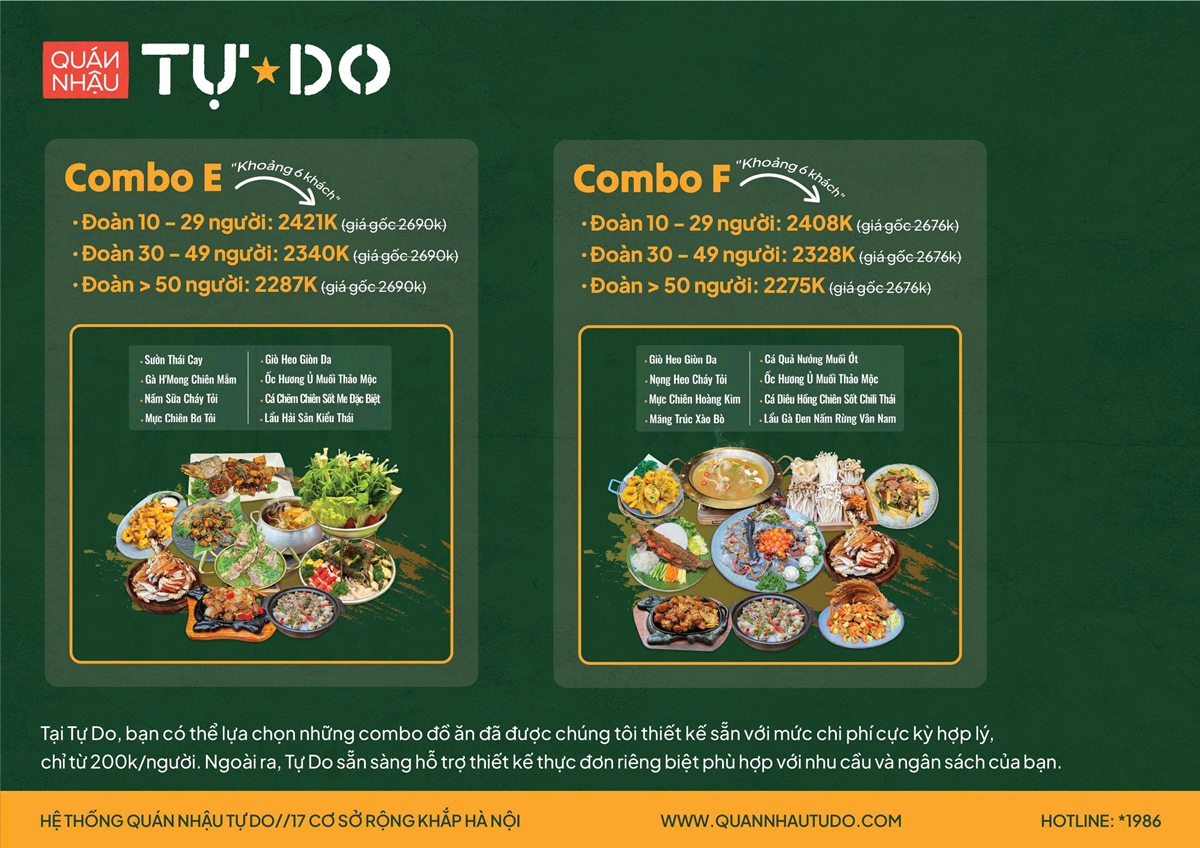 Tự Do 1: 10 Nguyễn Văn Huyên - Cầu GiấyTự Do 2: 505 Minh Khai - Hai Bà TrưngTự Do 3: 08 Lê Đại Hành - Hai Bà TrưngTự Do 4 : 58 Khúc Thừa Dụ - Cầu GiấyTự Do 5: 75 Yên Lãng - Đống ĐaTự Do 6: 01 Trần Xuân Soạn - Hai Bà TrưngTự Do 7: 02 Lê Đức Thọ - Cầu GiấyTự Do 8: 112 Nguyễn Văn Tuyết - Đống ĐaTự Do 9: 67A Phó Đức Chính - Ba ĐìnhTự Do 10: BT 1, Lô 11 Nguyễn Hữu Thọ - Hoàng MaiTự Do 11: 68 Khúc Thừa Dụ - Cầu GiấyTự Do 12: 68 Láng Thượng - Đống ĐaTự Do 13: Quán Nhậu Tự Do Mega Grand World - Ocean ParkTự Do 14: 201 Nguyễn Tuân - Thanh XuânTự Do 15: Vinhomes Smart City - GeleximcoTự Do 16: Lẩu Bò Tự Do Mega Grand World - Ocean ParkTự Do 17: 86 Hồng Tiến - Long Biên