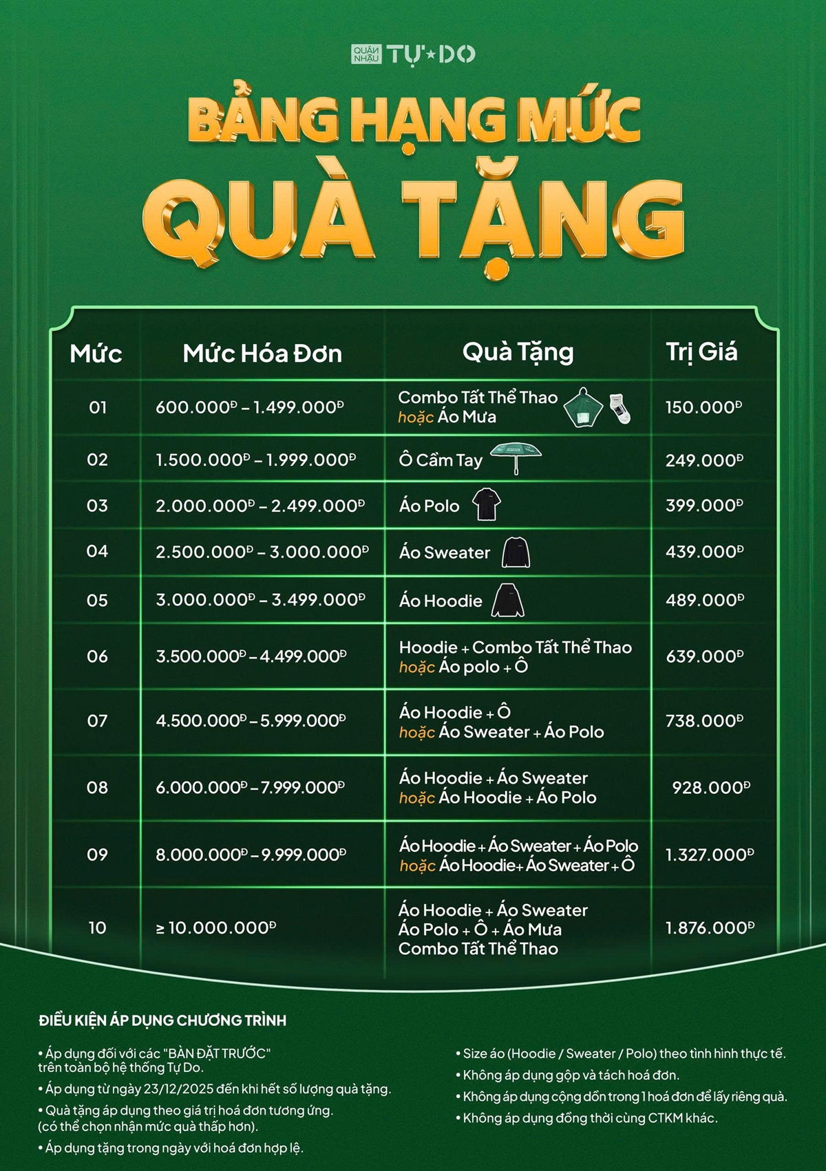 - Quà tặng áp dụng theo giá trị hoá đơn tương ứng (khách hàng có thể chọn nhận mức quà thấp hơn nếu muốn)