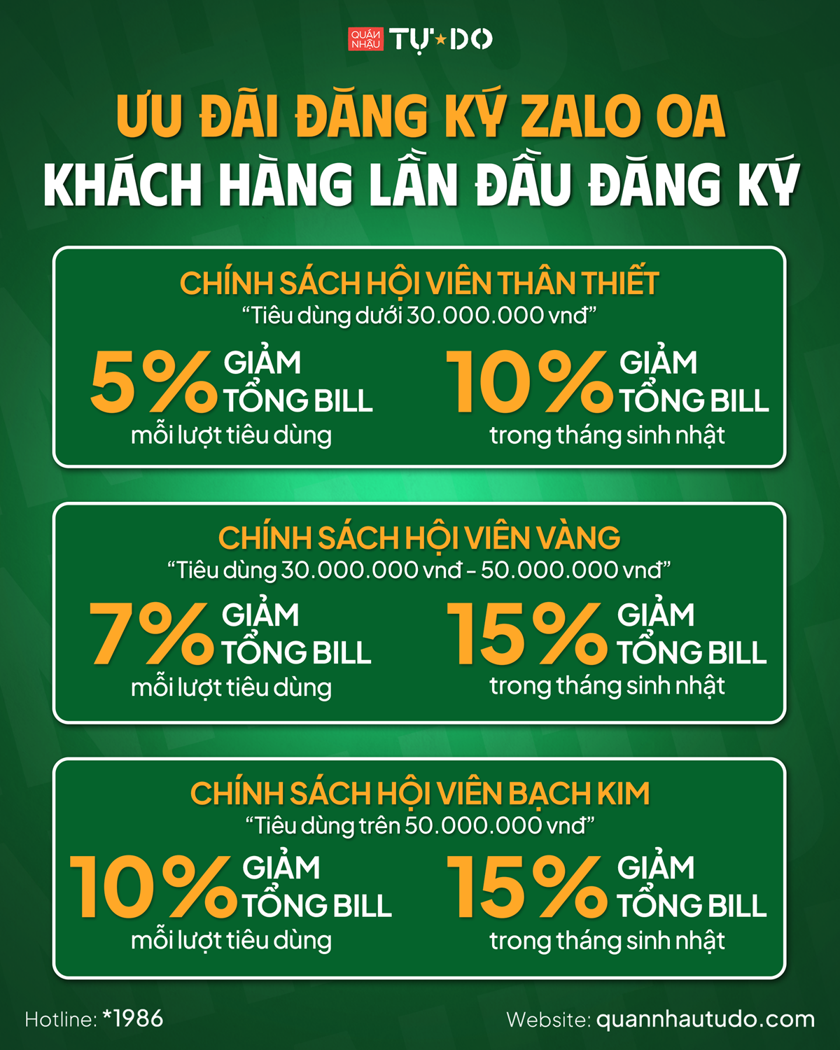 Nhằm mang tới trải nghiệm tiện ích cho anh em, đồng thời nhanh chóng cập nhật thông tin mọi lúc mọi nơi, Quán Nhậu Tự Do chính thức ra mắt kênh Official Account trên Zalo với nhiều đặc quyền hấp dẫn: